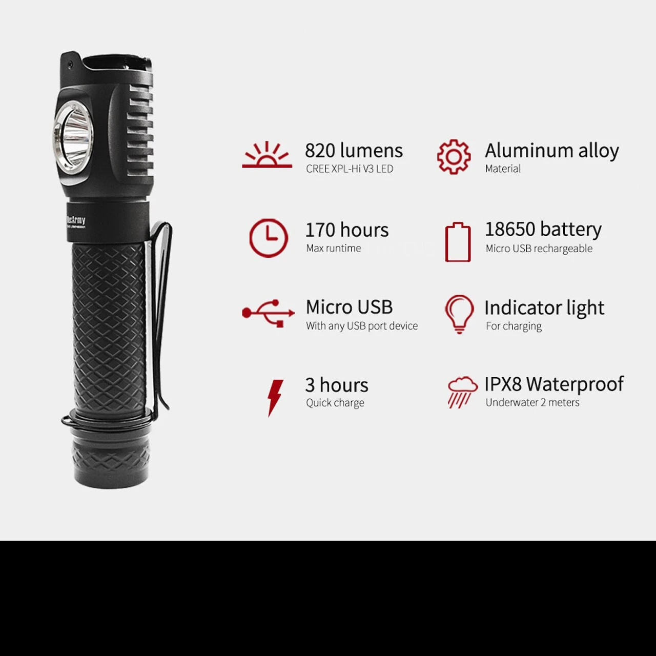 - Uses CREE XPL-Hi V3 LED, lifespan up to 50,000 hours